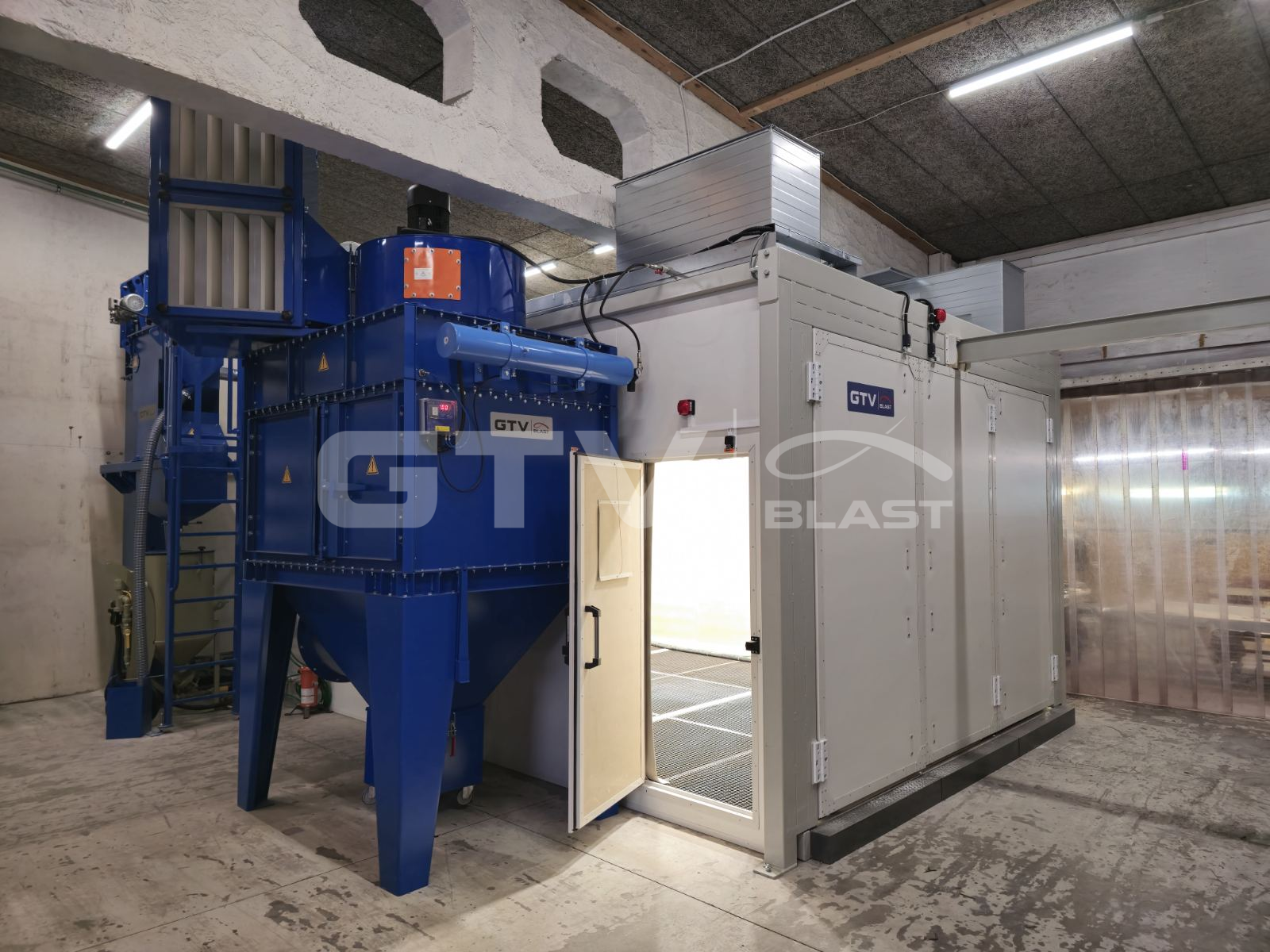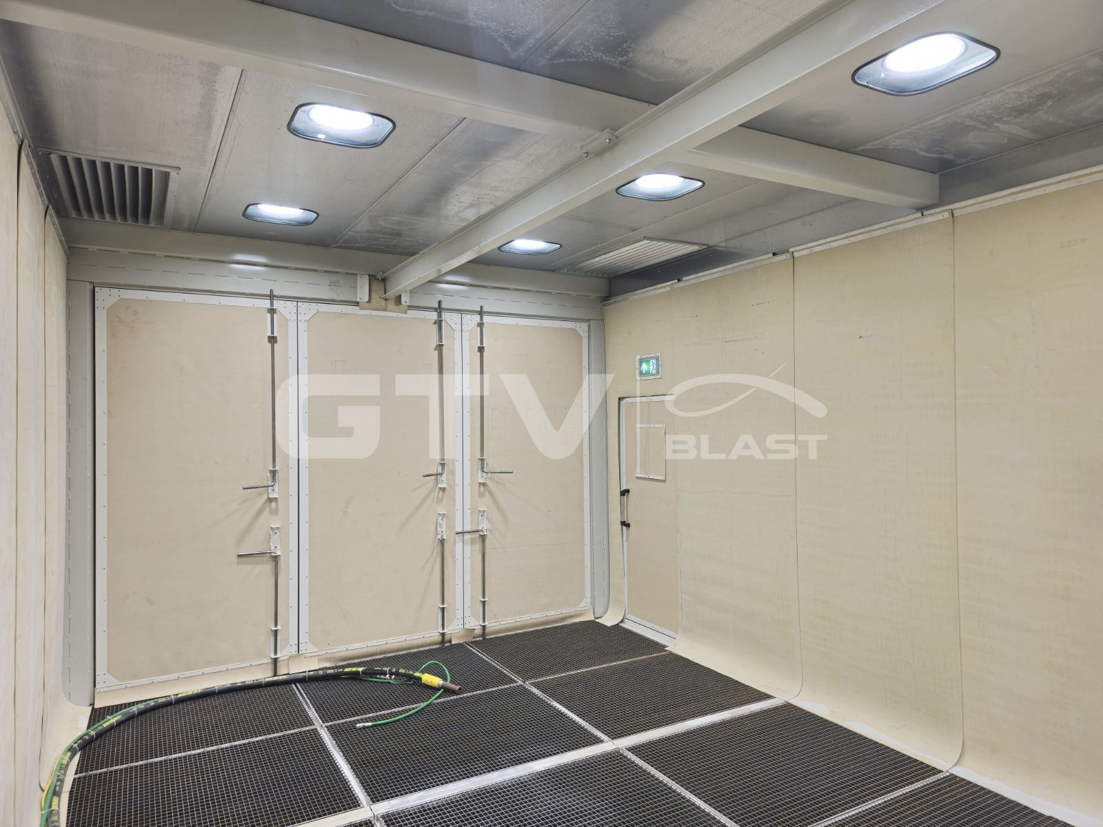 Sumontuota ir paleista rankinio šratavimo kamera 6x4x4 m. Skirta dirbti su stiklo abrazyvu.